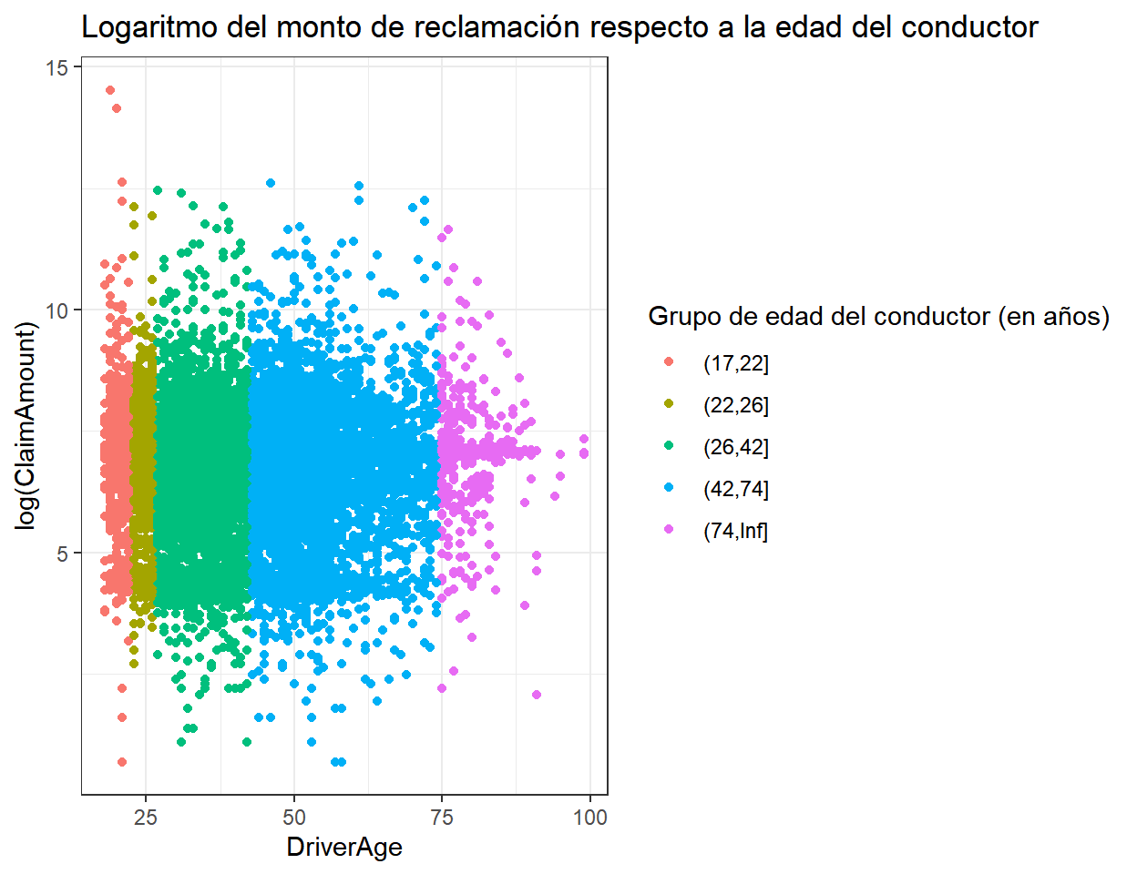 Ajustaremos una regresión gamma y una regresión lognormal usando DriverAge como variable explicativa continua.