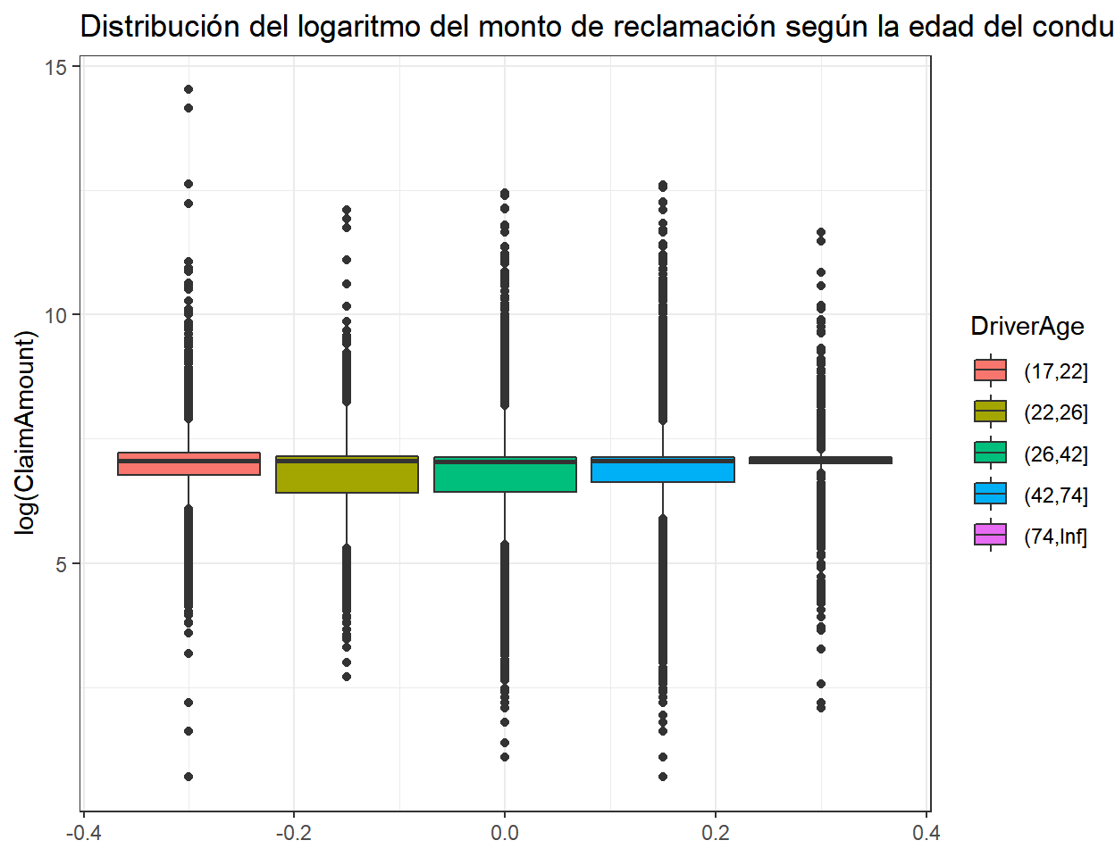 El grupo de edad de entre 17 y 22 años muestra diferencia en la distribución del monto de reclamación con los dos grupos siguientes; mientras que dichos dos grupos son más similares entre sí. Notamos que el grupo de mayor edad muestra una menor dispersión del monto de reclamación. Estas diferencias entre categorías pueden dar una idea sobre qué categorías serán significativas al ajustar un modelo de regresión.