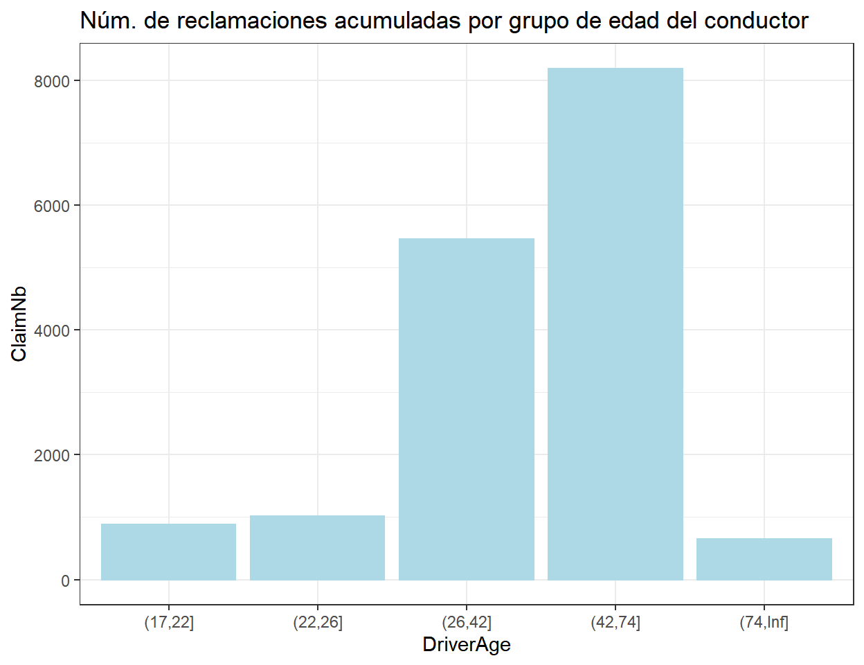 Es notorio que existe una mayor diferencia en el número de reclamaciones acumuladas de conductores en el grupo de edad de 42 a 74 años con el grupo de 17 a 22 años, mientras que este último grupo es más similar al de 22 a 26 años. Esto da un indicio sobre qué categorías son más significativas para explicar el número de reclamaciones.