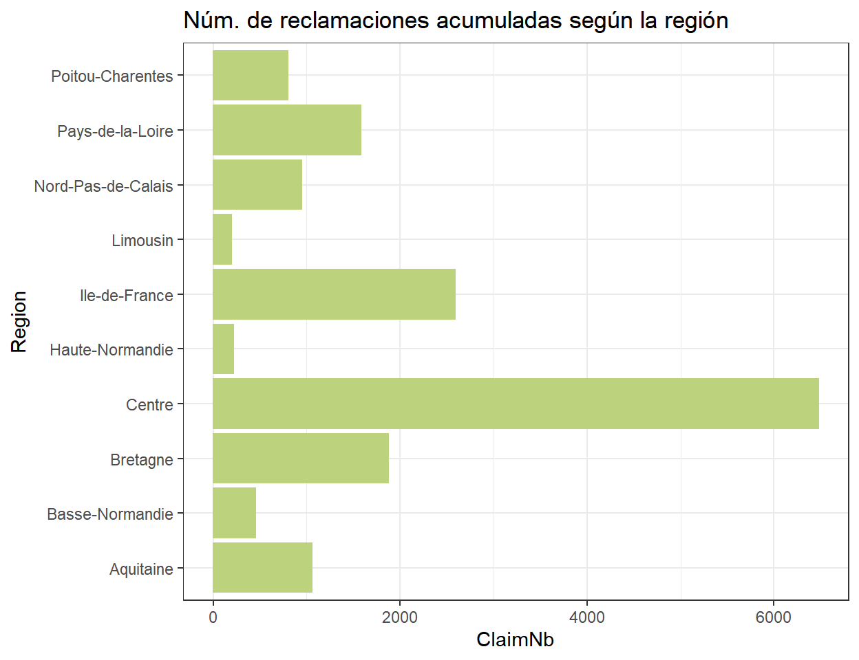 Como se puede observar en la tabla los porcentajes son muy similares para cada región (ninguno rebasa el 10%) pero la región Centre es la que tiene el la menor proporción de reclamaciones respecto a su exposición.